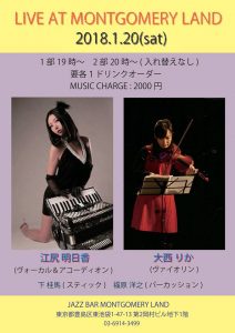 1月20日(土)は江尻明日香さんのヴォーカル・アコーディオン&大西りかさんのヴァイオリン & 下桂馬さんのスティック &福原洋之さんのパーカッションでライブが行われます。