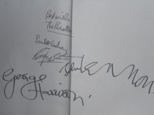 このサイン分かりますか?なんと、1966年、ビートルズ初来日の時の4人のサインです。